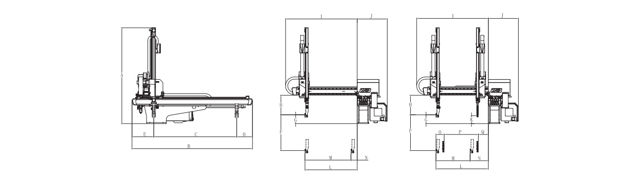 机型 | 手臂形式 | 适用塑机 | 上下行程 | 前后行程 | 横行行程 | 侧姿角度 | 最大负荷 | 最小取出时间 | 驱动方式 | 工作气压 |