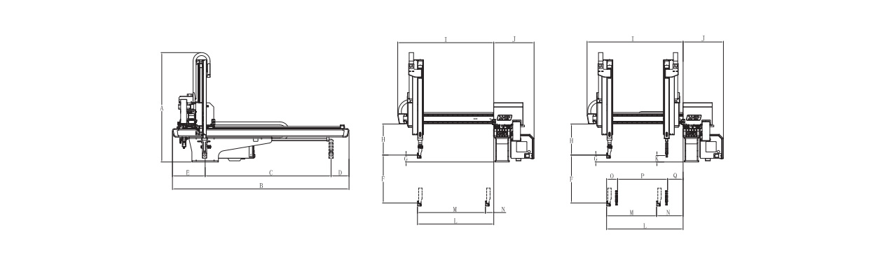 机型 | 手臂形式 | 适用塑机 | 上下行程 | 前后行程 | 横行行程 | 侧姿角度 | 最大负荷 | 最小取出时间 | 驱动方式 | 工作气压 | 空气消耗 | 电源 | 净重 |