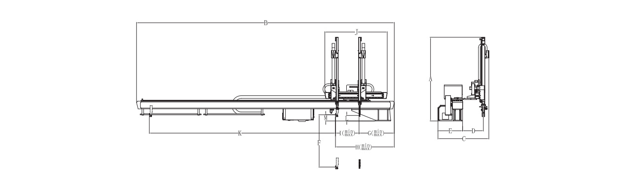 机型 | 手臂形式 | 适用塑机 | 上下行程 | 前后行程 | 横行行程 | 侧姿角度 | 最大负荷 | 最小取出时间 | 驱动方式 | 工作气压 | 空气消耗 | 电源 | 净重 |